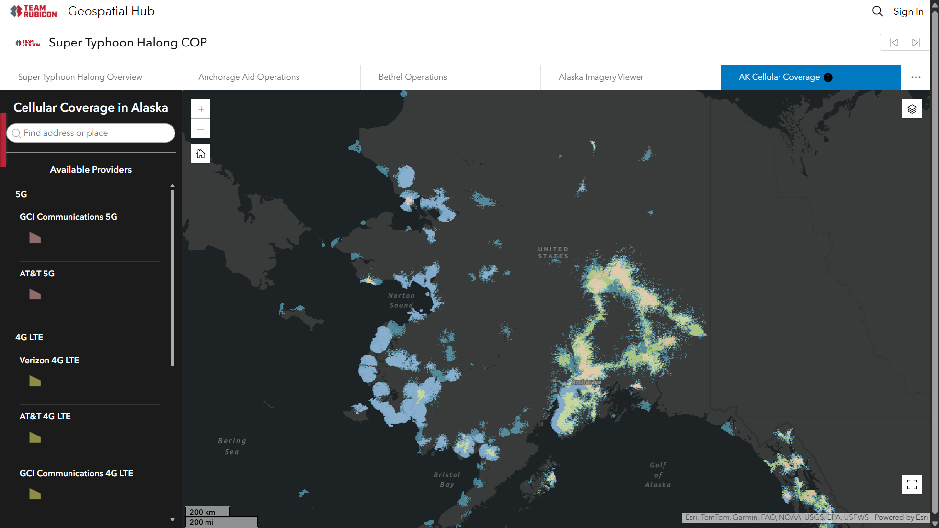 With Team Rubicon, I created this dashboard showing cell coverage in Alaska, as part of a larger ArcGIS Hub site, to support planning and field coordination during the response to Typhoon Halong in Alaska.